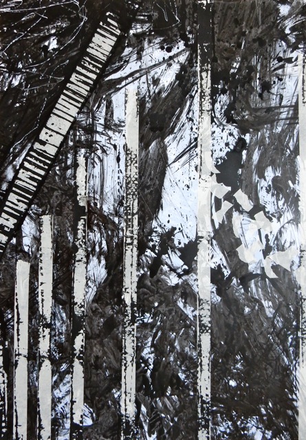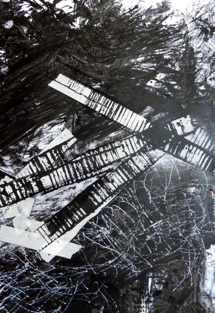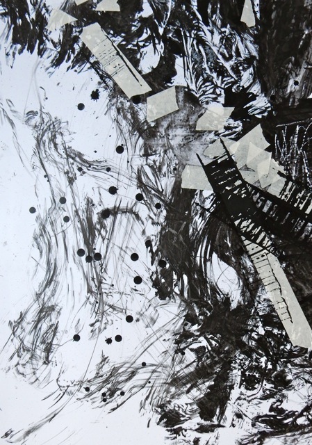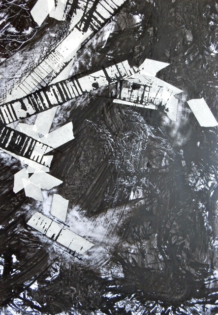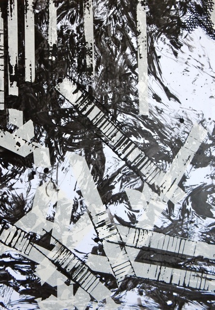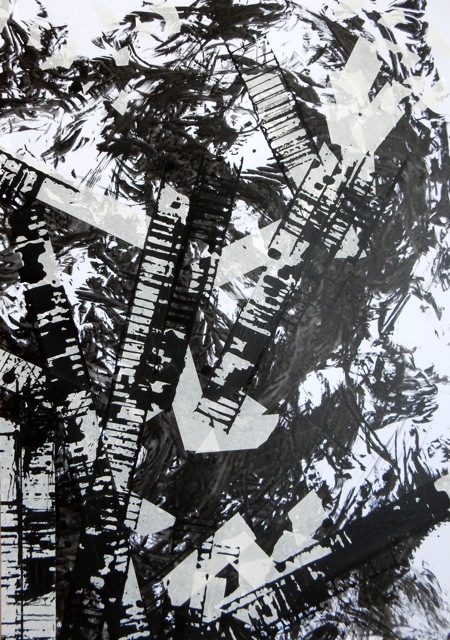 9 Arbeiten auf Kunststofffolien á 70 x 100 cm, schwarze Airbrushfarbe und Kreppband, 2015